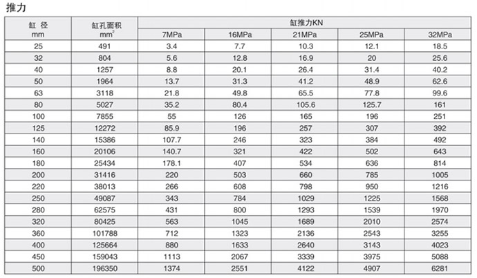 如果活塞桿受壓,則使用下面的推力表:找出最接近需要的工作壓力:在同一欄里,找出移動該負載所需的力;在同一行里,找出所需的缸徑。