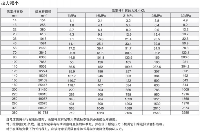 如果活塞桿受拉,則使用拉力減小表:按上述用于推用途的程序;使用下面的拉力減小表,根據(jù)所選的活塞桿徑和壓力確定所指示的力;從原來的推力中扣出此力,所得到的數(shù)值為可用來移動負載的凈力。